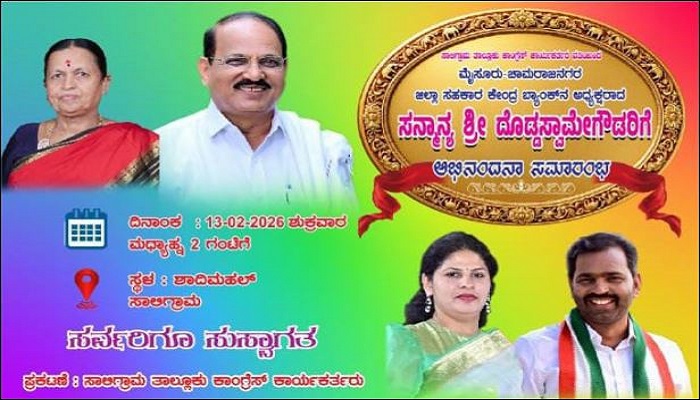 ಸಾಲಿಗ್ರಾಮ ತಾಲೂಕು ಕಾಂಗ್ರೆಸ್ ಪಕ್ಷದ ಕಾರ್ಯಕರ್ತರು ಹಾಗೂ ಅಭಿಮಾನಿಗಳಿಂದ ಫೆ. 13 ರಂದು ಸಾಲಿಗ್ರಾಮ ಪಟ್ಟಣದ ಶಾದಿ ಮಹಲ್ ಭವನದಲ್ಲಿ ಮಧ್ಯಾಹ್ನ 2 ಘಂಟೆಗೆ ಪಕ್ಷದ ಕಾರ್ಯಕರ್ತರ ಸಮ್ಮುಖದಲ್ಲಿ ಎಂಸಿಡಿಸಿಸಿ ಬ್ಯಾಂಕಿಗೆ ನೂತನವಾಗಿ ಅಧ್ಯಕ್ಷರಾಗಿ ಆಯ್ಕೆಯಾಗಿರುವ ದೊಡ್ಡಸ್ವಾಮೇಗೌಡ ಹಾಗೂ ಪತ್ನಿ ವನಜಾಕ್ಷಮ್ಮ, ಹಾಗೂ ಕ್ಷೇತ್ರದ ಶಾಸಕರಾದ ಡಿ.ರವಿಶಂಕರ್ ಹಾಗೂ ಪತ್ನಿ ಸುನಿತಾ ಡಿ.ರವಿಶಂಕರ್ ಅವರಿಗೆ ಅಭಿನಂದನಾ ಸನ್ಮಾನ ಕಾರ್ಯಕ್ರಮ ನಡೆಯಲಿದೆ.