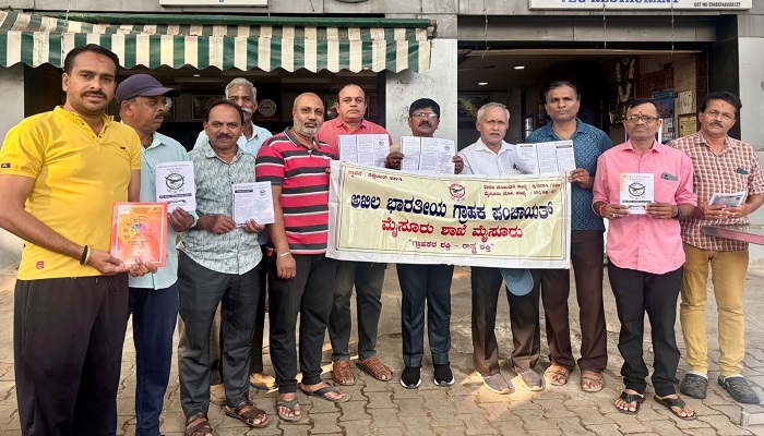ನಗರದ ಚಾಮುಂಡಿಪುರಂ ವೃತ್ತದಲ್ಲಿ ಅಖಿಲ ಭಾರತೀಯ ಗ್ರಾಹಕ ಪಂಚಾಯತ್ ಮೈಸೂರು ಘಟಕದ ವತಿಯಿಂದ ವಿಶ್ವ ಗ್ರಾಹಕರ ದಿನಾಚರಣೆ ಅಂಗವಾಗಿ ಗ್ರಾಹಕರ ಹಕ್ಕುಗಳ ಬಗ್ಗೆ ಜಾಗೃತಿ ಕಾರ್ಯಕ್ರಮದಲ್ಲಿಗ್ರಾಹಕರಿಗೆ ಗ್ರಾಹಕರ ಹಕ್ಕುಗಳ ಜಾಗೃತಿಯ ಕರಪತ್ರ ನೀಡಿ ಜಾಗೃತಿ ಕಾರ್ಯಕ್ರಮಕ್ಕೆ ಚಾಲನೆ ನೀಡಿ ಮಾತನಾಡಿದರು.