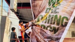 ಕುಶಾಲನಗರ (ರಘುಹೆಬ್ಬಾಲೆ): ಪಟ್ಟಣದ ರಥಬೀದಿಯಲ್ಲಿ ಬಟ್ಟೆ ಅಂಗಡಿಗೆ ಸಂಬಂಧಿಸಿದ ಬ್ಯಾನರ್ ಸಂಪೂರ್ಣ ಆಂಗ್ಲಭಾಷೆಯಲ್ಲಿರುವುದನ್ನು ಗಮನಿಸಿದ ಹೆಚ್.ಶಿವರಾಮೇಗೌಡರ ಕರ್ನಾಟಕ ರಕ್ಷಣಾ ವೇದಿಕೆ ಜಿಲ್ಲಾಧ್ಯಕ್ಷ ಡಾ.ಬಿ.ಎ.ದಿನೇಶ್ ಶೆಟ್ಟಿ ಮತ್ತು ಪ್ರಮುಖರು ಬ್ಯಾನರ್ ಅನ್ನು ಸೋಮವಾರ ತೆರವುಗೊಳಿಸಿದರು.