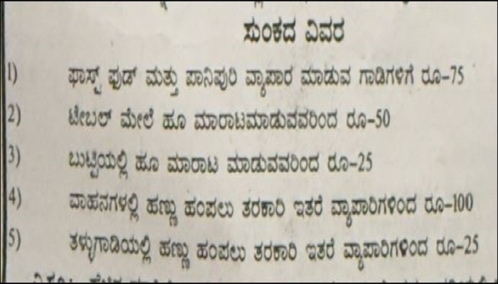 ಟೆಂಡರ್ ನಲ್ಲಿ ನಮೂದಿಸಿರುವಂತೆ ಪ್ರತಿದಿನವೂ ಪಾನಿಪೂರಿ ಗೋಬಿ ಮಾರುವ ಬೀದಿ ವ್ಯಾಪಾರಿಗಳು 75 ರೂಪಾಯಿ, ಟೇಬಲ್ ಮೇಲೆ ಹೂ ಮಾರುವವರು 50 ರೂಪಾಯಿ, ತಲೆ ಮೇಲೆ ಹೂವನ್ನು ಹೊತ್ತು ತಿರುಗುವವರು 25 ರೂಪಾಯಿ, ತಳ್ಳುಗಾಡಿಯಲ್ಲಿ ಬಿಸಿಲು ಮಳೆ ಲೆಕ್ಕಿಸದೆ ಸುತ್ತಿ ವ್ಯಾಪಾರ ಮಾಡುವವರು 25 ರೂಪಾಯಿ, ವಾಹನದಲ್ಲಿ ಸುತ್ತಿ ಮಾರಿದರೆ 100 ರೂಪಾಯಿ ನೀಡಲೇ ಬೇಕಂತೆ… ಈ ರೀತಿಯ ತೆರಿಗೆಯನ್ನು ಗಮನಿಸಿದರೆ ಇದು ಬಡವರ ಸರ್ಕಾರನಾ? ಪ್ರಶ್ನೆ ಮೂಡದಿರದು.. ಮಾತೆತ್ತಿದರೆ ಬಡವರ ಸರ್ಕಾರ ಎನ್ನುವ ನಾಯಕರು ಇದನ್ನೊಮ್ಮೆ ನೋಡಿ ಅರ್ಥವಾಗಿ ಬಿಡುತ್ತದೆ..