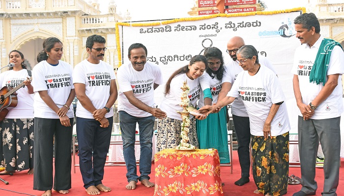 ಮೈಸೂರು: ನೂರಾರು ಮಹಿಳೆಯರು, ಹೆಣ್ಣು ಮಕ್ಕಳು, ಮಹಿಳೆಯರ ಕಳ್ಳ ಸಾಗಾಣೆ, ಲೈಂಗಿಕ ಶೋಷಣೆ, ಯುದ್ಧದ ವಿರುದ್ಧವಾಗಿ ಒಡನಾಡಿ ಯೋಗ ಸ್ಟಾಪ್ ಟ್ರಾಫಿಕಿಂಗ್ ಎಂಬ ಧ್ಯೇಯೊದ್ದೇಶದಿಂದ ಯೋಗಾಸನ ಕಾರ್ಯಕ್ರಮ ನಡೆಸಲಾಯಿತು.