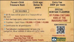 ಮಕ್ಕಳಲ್ಲಿ ಸಂಸ್ಕೃತಿಯ ಅರಿವು ಮೂಡಿಸುವ ಹಾಗೂ ಪೋಷಕ–ಮಕ್ಕಳ ಬಾಂಧವ್ಯವನ್ನು ಗಟ್ಟಿಗೊಳಿಸುವ ಉದ್ದೇಶದಿಂದ ಈ ಸ್ಪರ್ಧೆ ಹಮ್ಮಿಕೊಳ್ಳಲಾಗಿದೆ. 16 ವರ್ಷದೊಳಗಿನ ಮಕ್ಕಳಿಗಾಗಿ ರೂಪಿಸಲಾದ ಈ ವಿಶೇಷ ಟ್ರೆಷರ್ ಹಂಟ್ ಕಾರ್ಯಕ್ರಮ ಡಿಸೆಂಬರ್ 21 ನಡೆಯಲಿದೆ. ಅಂದು ಮಕ್ಕಳು ತಮ್ಮ ಪೋಷಕರ ಜೊತೆಗೆ ಬೆಳಿಗ್ಗೆ 7 ಗಂಟೆಗೆ ಶ್ರೀ ಕೋಟೆ ಆಂಜನೇಯ ಸ್ವಾಮಿ ದೇವಸ್ಥಾನದಲ್ಲಿ ಆರಂಭವಾಗುವ ಈ ಸ್ಪರ್ಧೆಯಲ್ಲಿ ಪಾಲ್ಗೊಳ್ಳಬಹುದು. ಇದೇ ಸ್ಥಳದಿಂದ ಸ್ಪರ್ಧೆ ಆರಂಭವಾಗಿ ಅಂತ್ಯಗೊಳ್ಳಲಿದೆ.